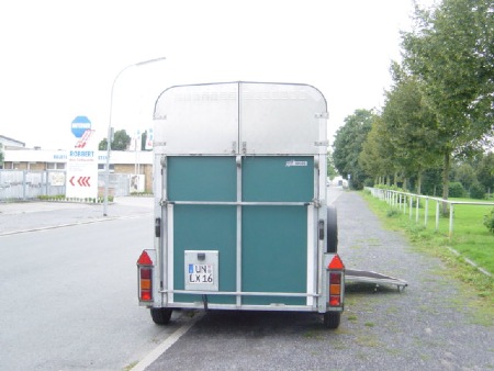 ![]() | ![]() | Ifor Williams Hunter HB 505 R Pferdeanhänger für 2 Pferde oder Pony´s Dieser Anhänger verfügt über eine vordere Entladerampe. Zum bequemen Ausladen der Pferde kann der vordere Teil der Trennwand zur Seite geschwenkt werden. Ifor Williams HB 505 R, Aufbau mit Alubeschichteten Seitenwänden, umlaufenden Bügeln und Aluminiumdach sowie Aluboden, sezielles Fahrwerk bestehend aus Starrachsen und Parabelfedern. Tandemachse, V-Deichsel, Auflaufbremse mit Rückfahrautomatik, verstärktes Stützrad und natürlich Ersatzrad. Maße und Gewichte (ca.)